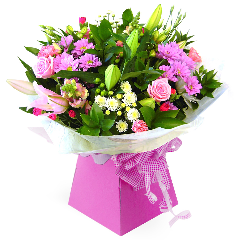 Ashleigh Hand Tied Bouquet in Gift Box, expertly arranged in a lovely mix of Pinks & Creams including lilies, roses, lisianthus, chrysanths and a mix of foliages, and gift wrapped in a complimentary cellophane.