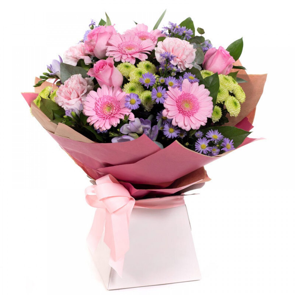 For Valentine's Day this year Send this lovely pink and lilac hand-tied featuring a mix of favourite flowers delivered in a delightful gift bag or box is the perfect way to send your thoughts.